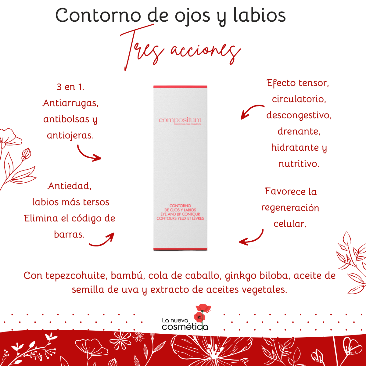 ¡Pero tranqui, no entres en pánico! Tenemos justo lo que necesitas. Nuestro Contorno de Ojos y Labios ha llegado al rescate para hacer magia en tu mirada. Con su fórmula avanzada y súper poderosa, este producto ofrece: